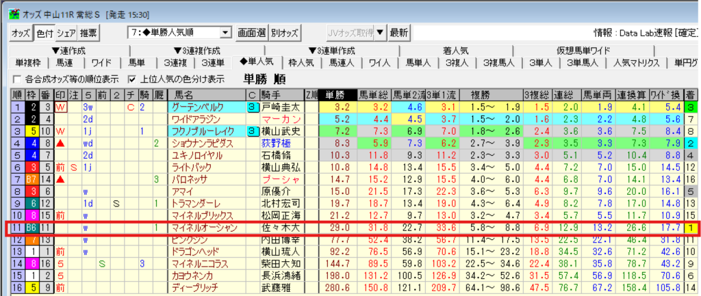 Win4 中山11R 常総ステークス 勝馬 11人気 マイネルオーシャン