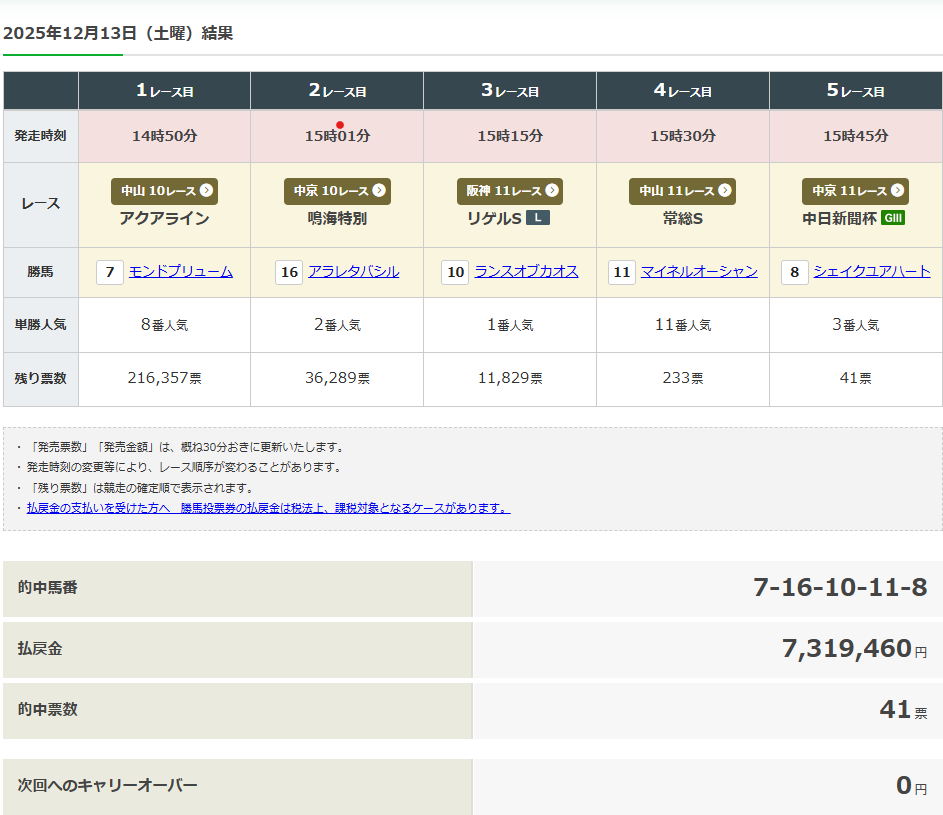 8番人気ー2番人気ー1番人気ー11番人気ー3番人気で人気の和が25、的中票数が41票、配当が7,319,460円。