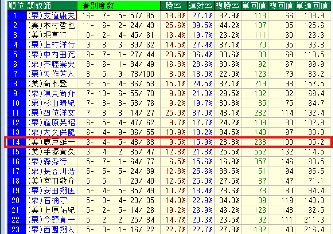 上位厩舎の中では鹿戸雄一厩舎のみ勝利。