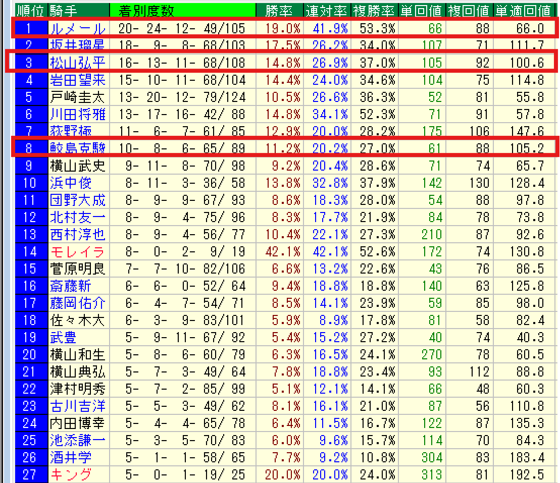 横山武史、戸崎圭太騎手とも高勝率で要警戒です。