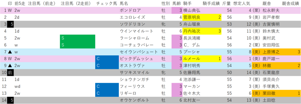 ビックデムッシュは、抑えるべき3歳馬の1番人気で、当コース騎手別成績1位のクリストフ・ルメールが手綱を取る。