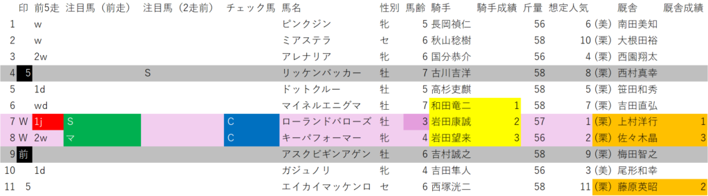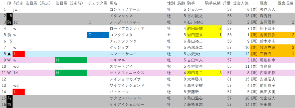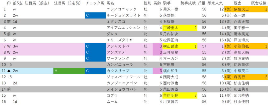 これから買える馬データ、消せる馬データを網羅した出走表をご覧いただきますが、出走表を簡単にご説明いたします。