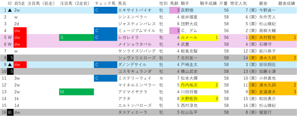 エキサイトバイオ、シンエンペラー、ジャスティンパレス、ミュージアムマイル、レガレイラ、メイショウタバル、ダノンデサイル、アドマイヤテラ、エルトンバローズ、タスティエーラ(10頭)