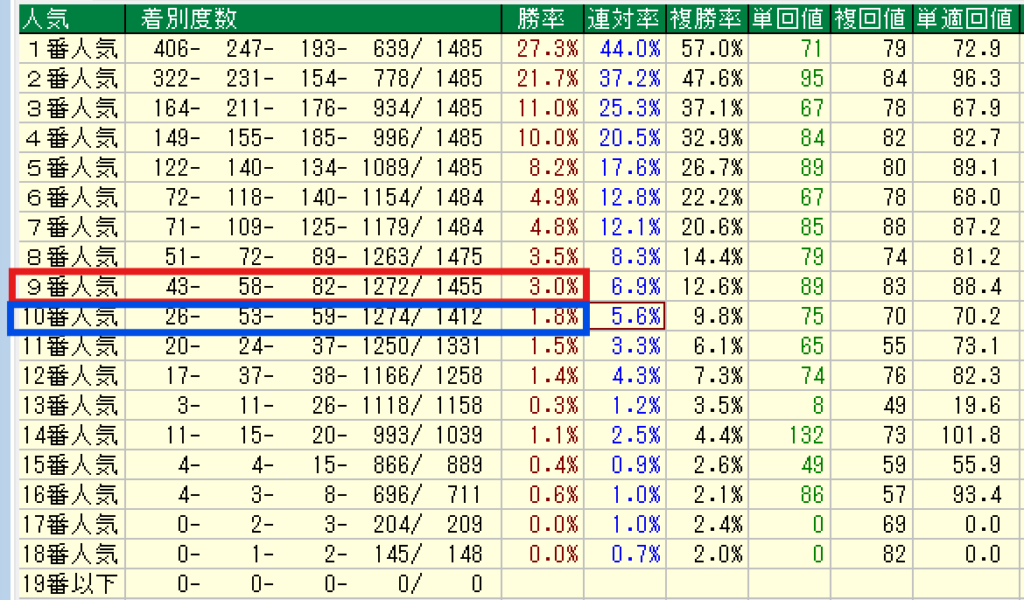 単勝9番人気を赤囲み、10番人気を青囲みしてますが、単勝9番人気の勝率が3.0%、10番人気の勝率が1.8%と大きな差があるのがおわかりでしょうか?