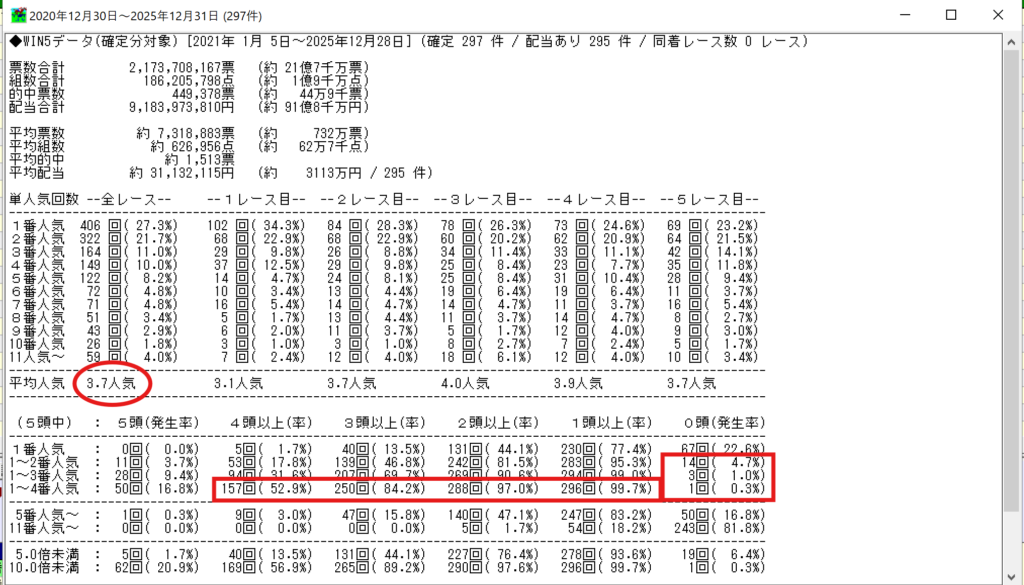 Win5の勝ち馬の単勝の平均人気はほぼ、4番人気