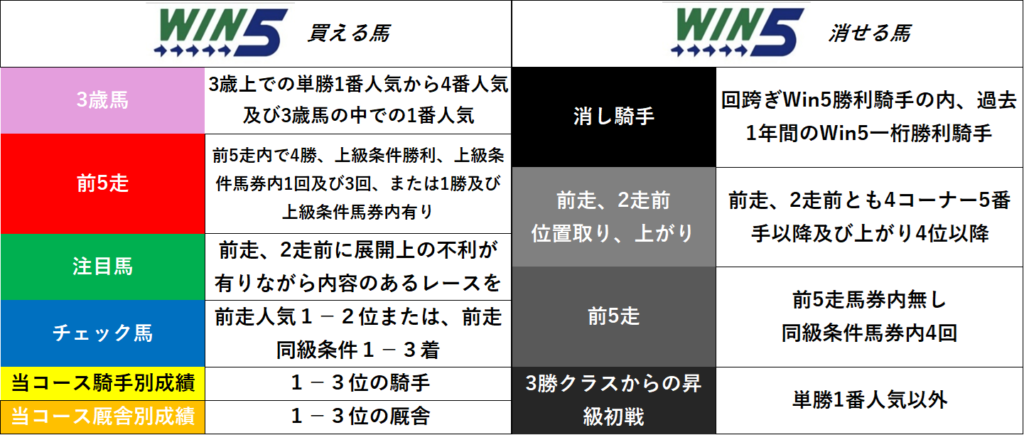 まずは、Win5の買える馬、消せる馬のデータの一覧をご紹介します。