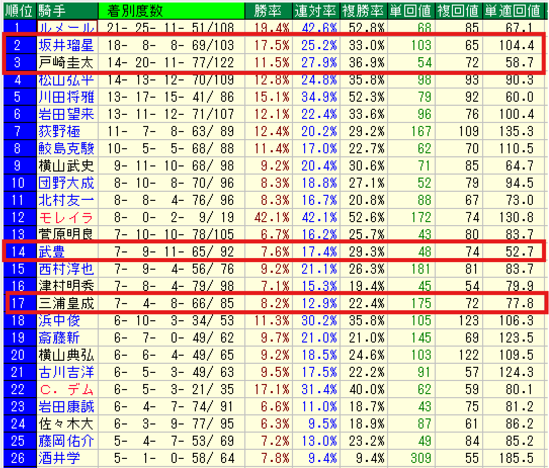 | 戸崎圭太 | 32- 29- 15-103/179 | 17.9% |