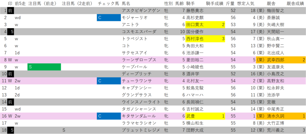 キタサンダムールはチェック馬×当コース騎手別成績1位の武豊騎手×当コース厩舎別成績1位の清水久詞厩舎との組み合わせで、いつも想定人気を見てから印を打つのですが、その前に印を打った馬。
