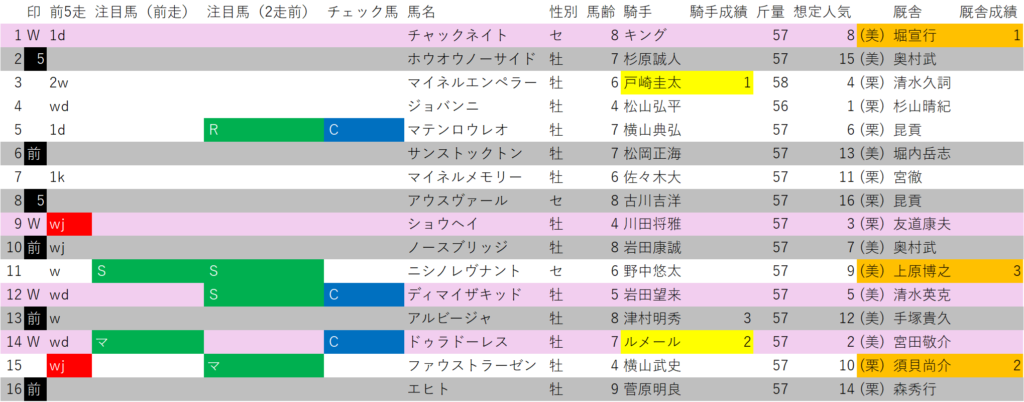 最後にチャックネイトは、当コース厩舎別成績1位の堀宣行厩舎管理馬。