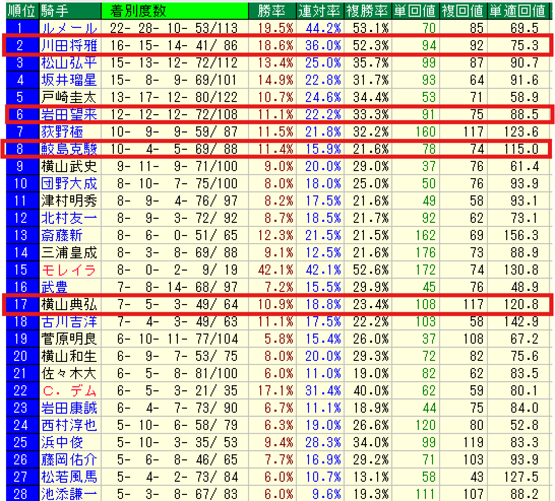 | ルメール | 13- 8- 6-17/44 | 29.5% |