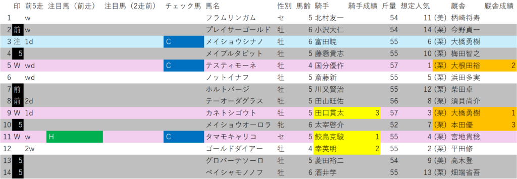Wには、想定1番人気の⑤テスティモーネ、想定3番人気の⑪タマモキャリコ、想定4番人気の⑨カネトシゴウトを指名します。