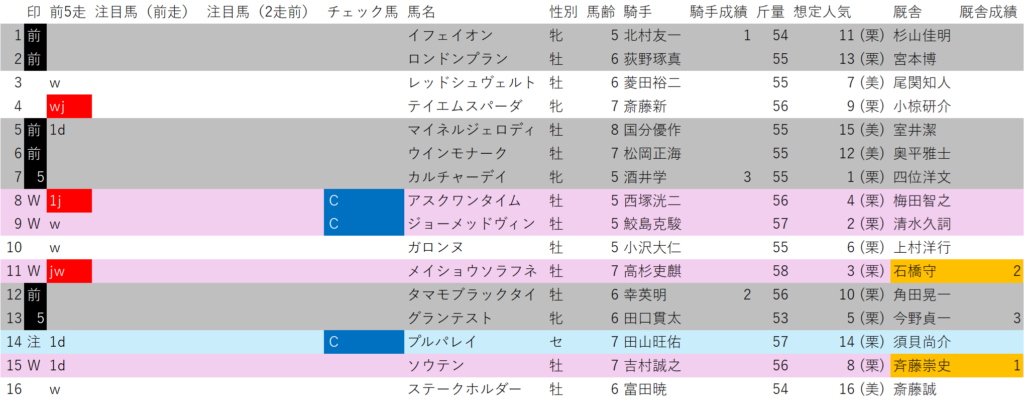 とは言え当日の脚質は、走ってみないとわからないので、出走馬の中で前走で4コーナーで4番手迄の馬は