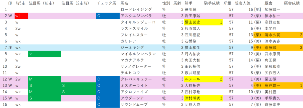 結果は残せませんでしたが、勝率の高い厩舎別成績1-3位の馬は前述の通り消せない。