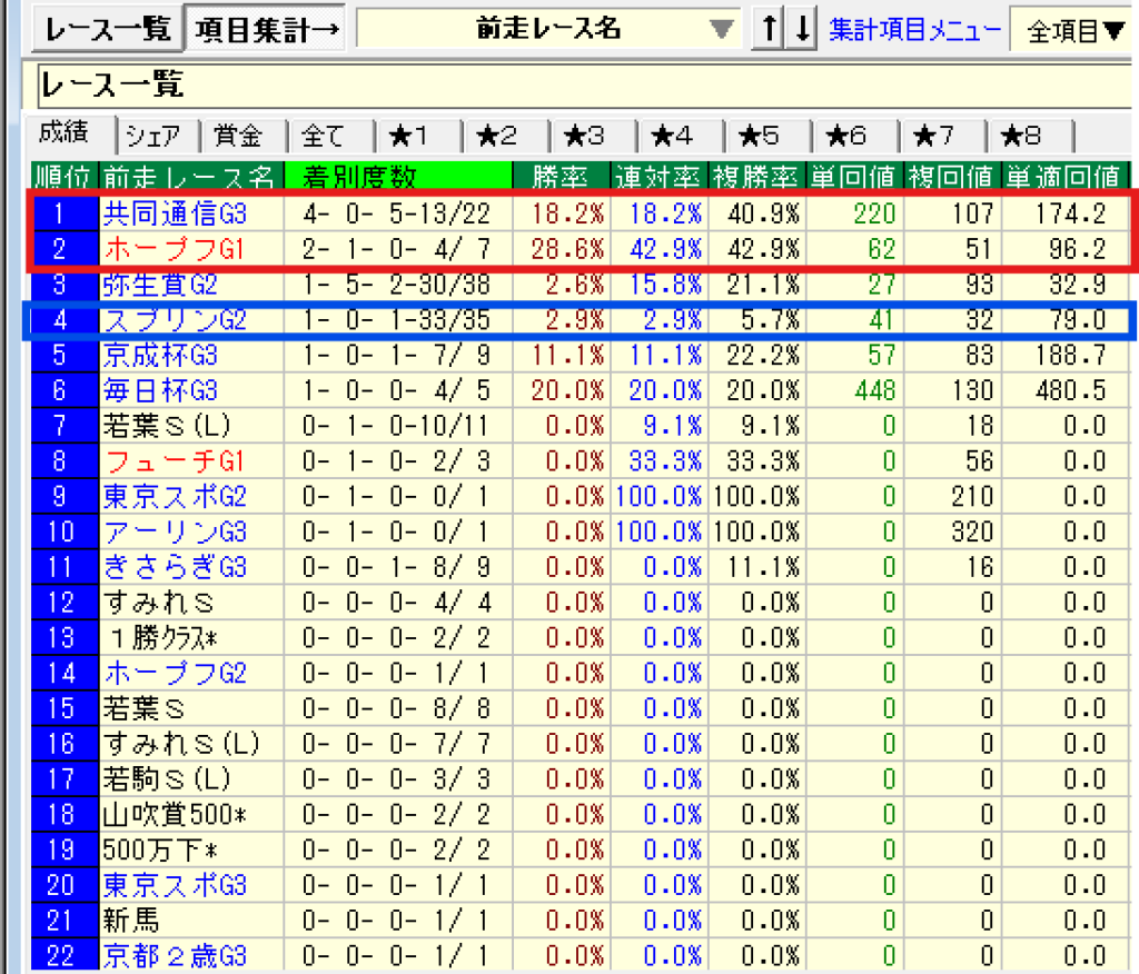 別の前哨戦のスプリングステークスは、勝率、連対率、複勝率も出走数に比べ一桁で散々な数字で消し対象。