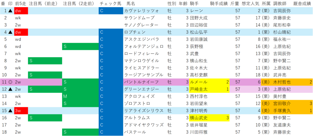 相手には、①カヴァレリツォ、④ロブチェン、⑫グリーンエナジー、⑮リアライズシリウスを買います。