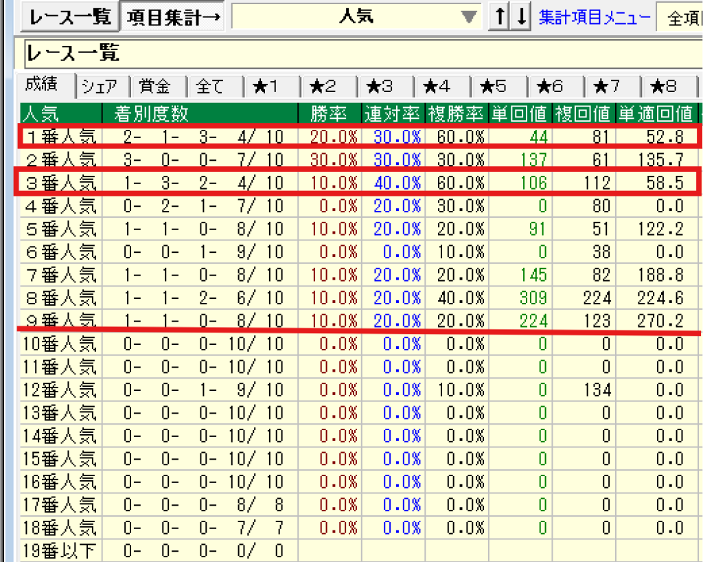 1番人気は僅か2勝ですが、連対率は30%、複勝率は60%と高勝率。