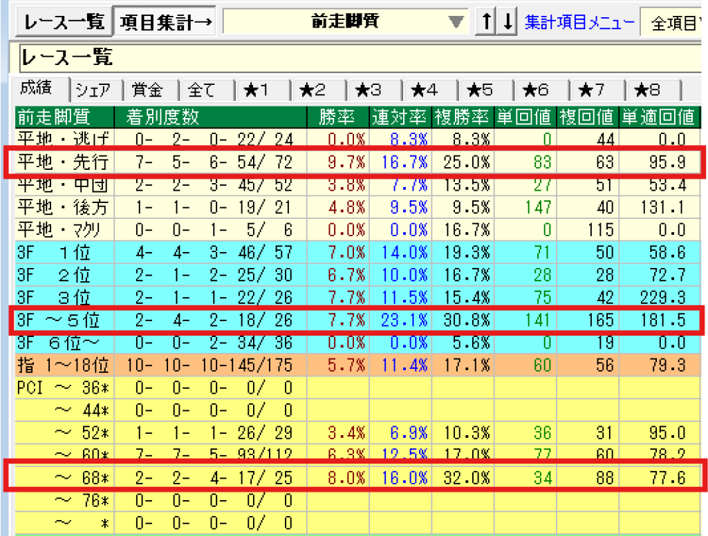 前走先行した馬が、7勝と圧倒的で、複勝率も25.0%で目立つ数字。