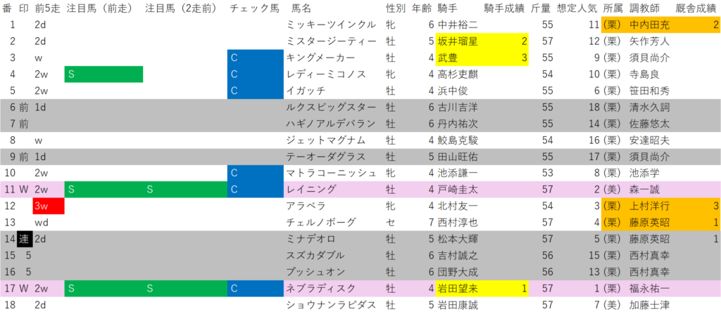 ファムクラジューズは、チェック馬×当コース騎手別成績1位の横山武史騎手×当コース厩舎別成績1位の黒岩陽一厩舎との組み合わせ。