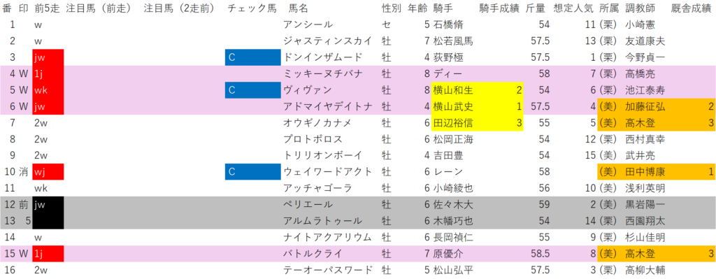 想定4番人気⑥アドマイヤデイトナ、想定6番人気⑤ヴィヴァン、想定7番人気④ミッキーヌチバナ、想定8番人気⑮バトルクライです。