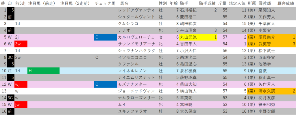想定1番人気⑥サウンドモリアーナ、想定2番人気の⑤カルロヴェローチェ、想定7番人気の⑫モズナナスター、想定10番人気の⑮ムイです。