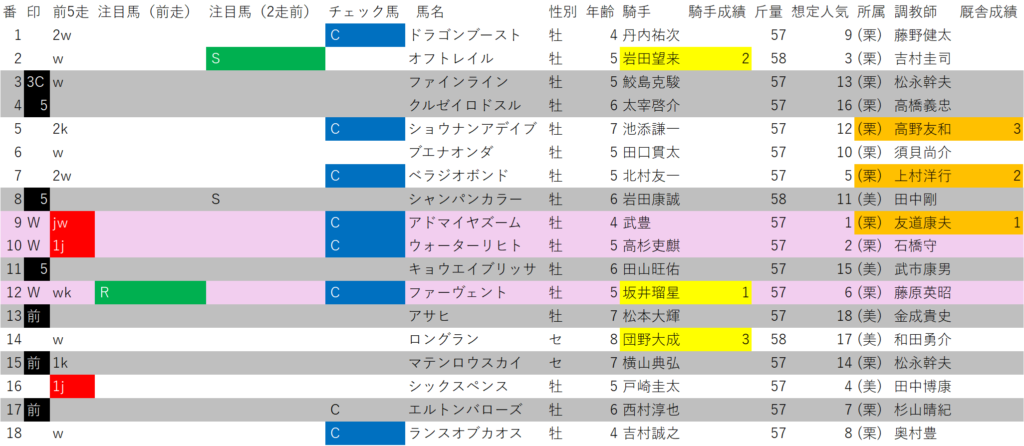 相手は、②オフトレイル、⑤ショウナンアデイブ、⑦ベラジオボンド、⑩ウォーターリヒト、⑫ファーヴェント。