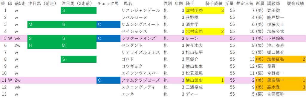 Wに指名は、想定1番人気の⑤ラフターラインズと想定人気2番人気の⑪ファムクラジューズの2頭推し。