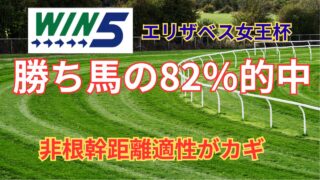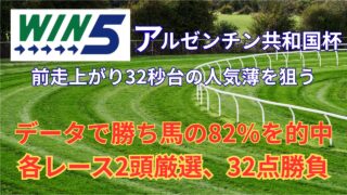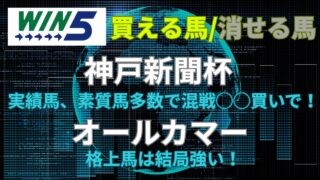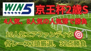 Win5買える馬(Win5勝馬の過半数を占めるデータ)消せる馬(過去1年間のWin5で勝率2%のデータ)で絞り30点台Win5で帯封を目指します。